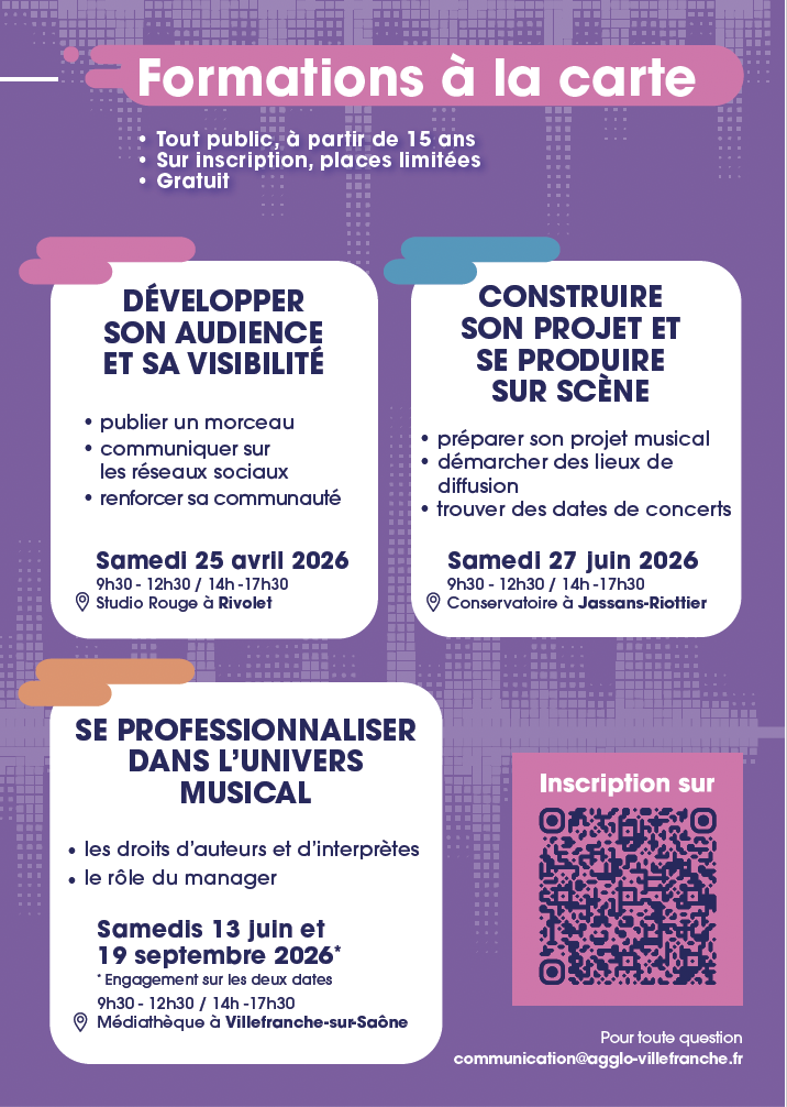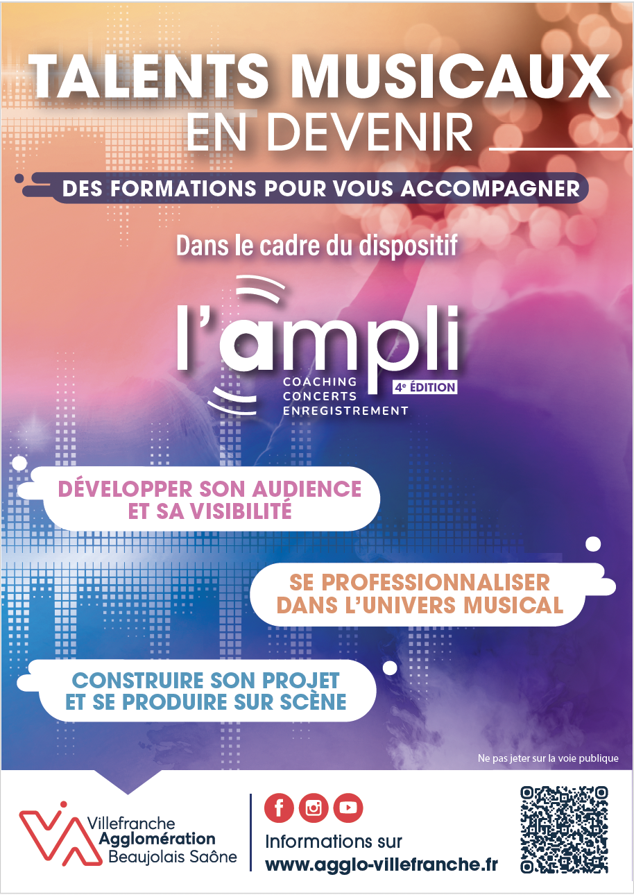 La Communauté d’Agglomération Villefranche Beaujolais Saône, à travers le dispositif l’ampli #4, propose aux talents en devenir plusieurs formations à la carte pour leur donner des clés et les accompagner dans leurs projets artistiques.